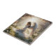 Dieses Keramik Fliesen Kunstwerk präsentiert eine ruhige und angelsächsische Szene. In der Mitte befindet sich eine kniende Figur mit großen, weißen Flügeln, die in einem von der Schulter getragenen, fließenden weißen Ziegenkleid eingezogen sind. Das lange Haar der Figur kaskadiert sanft, was zu ihrer ruhigen und himmlischen Präsenz beiträgt. Der Rahmen ist üppig, gartenähnlich und mit feinen, weißen Blume und üppiger Vegetation gestaltet, was eine ätherische Atmosphäre schafft. Im Hintergrund sind die Grabsteine sorgfältig positioniert, was darauf schließen lässt, dass dieser friedliche Garten Teil eines Friedhofs sein könnte. Weiche Lichtbalken filtern durch die Bäume, wobei ein himmlisches Glühen auf die kniende Figur, die feierliche und dennoch beruhigende Essenz der Szene. Während die Kachel den traditionellen Buntglasstil nachahmt, trägt sie ihren eigenen Charme, mit subtilen Schattierungen und textuellen Elementen, die der Komposition Tiefe verleihen. Dieses Stück vereint Themen der Reflexion, der Erinnerung und der spirituellen Ruhe und macht es zu einem eindrucksvollen Beispiel für künstlerisches Geschichtenerzählen durch Keramik-Handwerk.