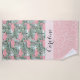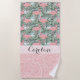 Freuen Sie sich auf Komfort am Strand oder am Pool und lassen Sie sich von diesem farbenfrohen Strandtuch cool und abkühlen. Lassen Sie sich im Sand von diesem schönen, zeitgenössischen pastellrosa Flamingos auf grünen Palmenblättern mit hellen türkisfarbenen Aqua und blass blauen Aquarellpinselstrichen abheben. Mit Raum zum Anpassen oder Personalisieren mit Namen, Monogramm oder Initialen Ihrer Wahl. Verziertes, trendiges, modernes und skurriles Design für die künstlerische Mode oder künstlerische Mode-Diva, angesagter Trendsetter, Vintager Retro-Aquarellmalerei-Stil oder abstrakter Motivliebhaber.