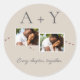 Ein rundes Aufkleberlayout mit zwei kleinen Fotos, die durch eine gepunktete Linie verbunden sind, obenstehenden Kohle-Serif-Initialen und einem Skriptziffer unten. Beige Sets sorgen für ein sanftes Ambiente. Ein minimaler Foto-Layout-Aufkleber, der für sinnvolle Geschichten und geteilte Momente konzipiert ist.