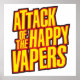 Die Phrase "Angriff der glücklichen Vapers" in einem fett gelben und roten Logo auf der Grundlage von Retro-Horror-Filmplakaten. Vaping Spaß für alle fröhlichen Benutzer.