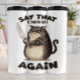 Diese sonderbare Grafik zeigt eine wütende, chubby Katze, die ein großes Messer hält. Das einschüchternde und humorvolle Design wird mit dem Text 'SAGE DAS WIEDER' vervollständigt, der ein lustiges und sarkastisches Statement-Stück schafft.