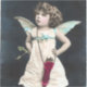 Eine Vintage Postkarte aus dem öffentlichen Bereich, mit einem Kind, das als Cupid gekleidet ist und verärgert Ausdruck hat. Es wäre ein niedliches Valentin.