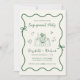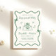 Retro-inspirierte helle cremefarbene Hochzeitsfeier mit einem geheimnisvollen, grün gewellten Rahmen mit Kokettenbögen und von Hand gezeichnet Bildern von Herzen, Sternen und einem eleganten romantischen Tisch. Die "Engagement Party" und die Namen der Braut und des Bräutigams werden in einem spielerisch grünen Skript gezeigt.
