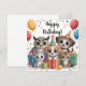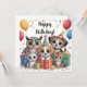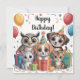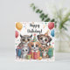 A festive and heartwarming digital illustration featuring a group of adorable baby animals celebrating a birthday. The scene includes two wide-eyed puppies and a wise owl wearing striped party hats, accompanied by two charming kittens. They are surrounded by colorful wrapped gifts with ribbons, floating balloons in red, blue, and yellow, and scattered confetti and streamers.