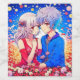 Niedliches Anime Mädchen und Junge in Rot und Blau umgeben von Herzen und Blume. Valentinstag Party Leckereien.