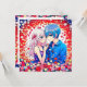 Personalisierte Hochzeitseinladungen mit Animes. Anime Junge und Mädchen kuscheln umgeben von bunten Blume. Niedliches Anime-Paar, Mädchen mit rosa Haar und Junge mit blauen Haaren. Die Farben sind rot, blau, weiß, rosa und lila.