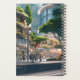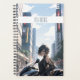 Anime-Malerei einer jungen Frau mit kurzem schwarzem Haar in einem schwarzen Outfit, stehend von ihrem schwarzen Motorrad auf einer belebten Stadtstraße.