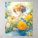 Blau-gelbe Aquarellfarben-Blume mit einem hübschen Anime-Mädchen, das drinnen sitzt. Ai Art.