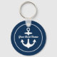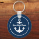 Das Round nautical Schlüsselanhänger Design zeichnet sich durch ein schlichtes, stilvolles marineblau-weißes Küstendesign mit Bootanker-Akzent aus. Personalisieren Sie den Skripttext mit dem Namen Ihres Bootes.