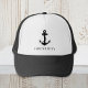 Nautical-themed schwarzer Hut mit einer Abbildung eines klassischen Ankeres und dem Namen Ihres Bootes in einfacher Typografie.