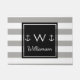 Moderne, dicke, weiße Streifen mit auffälligen grauen Streifen (kann über den Button "Anpassen!" geändert werden). Das Zentrum verfügt über einen schwarzen dekorativen Platz, einen personalisierten Monogramm-Brief und einen vollen Familiennamen in Weiß mit Ankern.