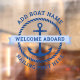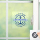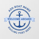 Fensterklemme mit einem dunkelblauen nautischen Anker, umgeben von einem Seilstreifen auf weißem Hintergrund. Über dem Anker befindet sich ein hellblaues Band mit eigenem Text "welcome on board". Fügen Sie Ihren Bootsnamen oben und den Hafen unten hinzu.