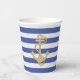Nautische Papiertasse in einem blau-weiß gestreiften Muster, mit Grafik eines goldenen Ankeres. Ideal für alle Arten von maritimen Party.