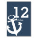 Gedruckte Tischnummer-Karte mit marineblau-weißem Ankerdesign zum Kompliment unseres Hochzeitseinladungs-Set, kann personalisiert und individuell bestellt werden.