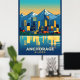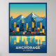 Eine stilisierte Abbildung der Anchorage, der Skyline von Alaska bei Sonnenuntergang mit Bergen, Wasser und städtischen Gebäude.