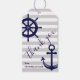 Dieses dekorative Design besticht durch einen dunkelmarineblau-Anker und ein Schiffsrad mit grauen und weißen Streifen. Die nautische Illustration erstellt moderne und einzigartige Geschenketiketten mit personalisiertem Text und Hintergrundfarbe.