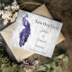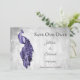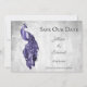 Personalisieren Sie eine einmalige Hochzeitsankündigung mit einem Lila Pfau Save the Date. Das Design der Ankündigung besticht durch einen eleganten Pfau vor zartem Laub, Grunge und Text, den Sie mit Ihren Hochzeitstermin-Details personalisieren können. Zusätzliche Ankündigung Datum freihalten für dieses Design in verschiedenen Farben verfügbar.