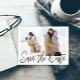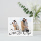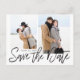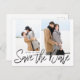 Eine handgeschriebene Save the Date Überschrift überträgt Ihre Lieblings-Verlobung-Fotos in dieser modernen Ankündigung Datum freihalten. Die Headline kann sowohl für den Anzug als auch für die Ausrichtung des Fotos positioniert werden. Verwenden Sie die Rückseite, um weitere Details anzugeben.