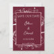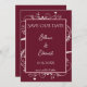 Personalisieren Sie eine einzigartige Hochzeitsankündigung mit einem Wein Geblüht Save the Date. Das Design der Ankündigung besticht durch ein elegantes, mit farbigem Hintergrund geblüht Design, das Sie mit Ihren Hochzeitstermin-Details personalisieren können. Zusätzliche Ankündigung Datum freihalten für dieses Design in verschiedenen Farben verfügbar.