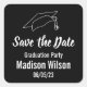 "Save the Date" für eine Graduierungsparty mit diesem schwarzen, weißen und Imitat (nicht Folie) goldenen Aufkleber. Passen Sie den Namen und das Party des Absolventen an. Die Kappe eines Absolventen befindet sich oben über dem Text auf einem schwarzen Hintergrund.