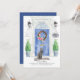 Mit unserer stilvollen Ankündigung kündigen Sie Ihre neue Adresse an: eine blaue Russische Katze, blaue Haustür, Begrüßungstür, Schild mit Schiefer, Topiaries und ein Set mit Blumenkranz auf grauem Backstein.