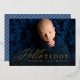 Diese 1-Foto-Geburtsankündigung enthält neben einem Namen oder Spitznamen in Folie ein elegantes Drehbuch "hello". Es enthält auch Platz für den Namen des Babys und andere Details am unteren Ende eines horizontalen Fotos. Die blaue Farbe des Backers macht es perfekt, um einen kleinen Jungen anzukündigen und sich mit neugeborenen Fotos abzustimmen. Auf der Rückseite befindet sich auch ein zweites Foto. Weitere Farben sind ebenfalls verfügbar.