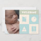 Vier Buchstaben Baby Name Gratulationskarte für einen Neugeborenen und seine Eltern in neutralen pastellfarbenen, hellblauen, beigen Farben. Die 4 Buchstaben sind individuell an den Namen der Kinder angepasst. Die Buchstaben werden in einem niedlichen Schriftart ausgewählt, sodass es kindisch figurativ aussieht. Fügen Sie Ihr eigenes Foto hinzu und passen Sie alle Texte nach Ihren Wünschen an.