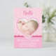 Rosa Herz mit weißer Spitze und Herz auf dem Hintergrund. Passen Sie diese Geburtsankündigung für Ihr Neugeborenes mit Ihrem Foto und Text an und personalisieren Sie sie.