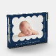 Einfache und moderne Geburtsankündigung Foto-Block mit dem Foto Ihres Babys, eingebettet in einem marokkanischen Skalloprahmen. Personalisieren Sie den Foto-Block, indem Sie den Namen Ihres Babys und zusätzliche Informationen in weißer Schrift hinzufügen.
