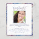 Eine preisgünstige, moderne Abschluss-Ankündigung, gedruckt auf 4,5x5,6-Zoll-Leichtpapier statt auf einem mehrfarbigen Pinselstrich GRADUATE-Titel auf der Vorderseite und 4 Fotos (eine Foto-Collage von 3 Aufnahmen auf der Vorderseite und 1 auf der Rückseite). Auf der Rückseite finden Sie ein optionales Textfeld, das Sie mit Ihren individuellen Informationen über Ihren Absolventen personalisieren können. Ideal für konservative Budgets und/oder Handarbeit. HILFE: Für Hilfe bei der Modifikation/Personalisierung des Designs, bei Farbänderungen, bei der Übertragung des Designs auf ein anderes Produkt oder wenn Sie die Dinge koordinieren möchten, wenden Sie sich bitte an den Designer, BEVOR Sie über Zazzle Chat oder makeitaboutyoustore@gmail.com bestellen.
