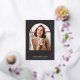 Die elegante Ankündigung des Foto Abschlusses zeigt ein vertikal oder portrait orientiertes Foto in einem einzigartigen Gewölbe auf kohleschwarzem Hintergrund mit Rose Goldfolie. Darunter erscheint "Absolvent", zusammen mit dem Namen Ihres Absolventen und der Schule oder Uni. Fügen Sie der Rückseite eine persönliche Nachricht und ein zusätzliches Foto hinzu.