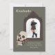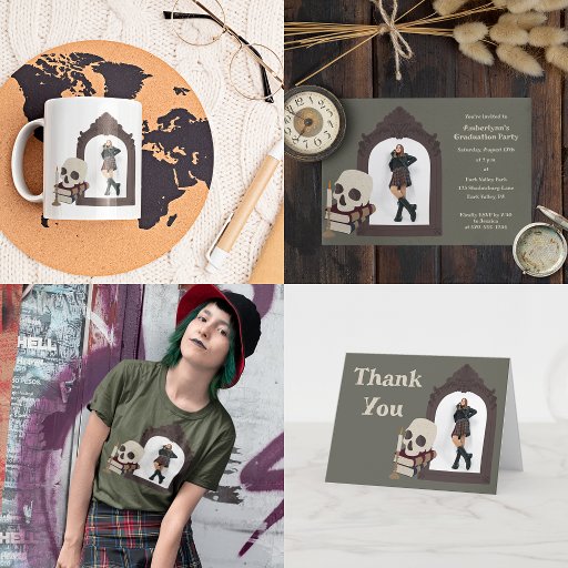 Feiern Sie Ihren Absolvent mit dieser düsteren akademischen thematischen Abschluss Ankündigung. Diese flache Paneelankündigung ist fertig, um mit Ihrem eigenen Foto und Informationen auf der Vorderseite und Ihrer eigenen Nachricht auf der Rückseite individuell angepasst zu werden. Es zeigt eine Abbildung eines Schädels, eine Kerze in einem Kerzenhalter, einige antike Bücher und ein verziertes Set in einem dunkelgraugrünen Hintergrund.