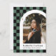 Diese moderne und einzigartige Ankündigung des Abschlusses zeigt einen grün-schwarz-karierten Hintergrund, der ein gerahmtes Foto des Absolventen in einem weißen Bogen mit dem Namen und der Schule des Absolventen unterstreicht. Eine kleine Gradationskappe wird im überprüften Hintergrund des Abschlusses des Absolventen geschickt angezeigt. Der Rücken hat ein passendes Muster in Weiß und Schwarz.