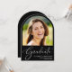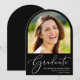 Arch-förmige Ankündigung des schwarzen Abschlusses mit dem Foto des Absolventen, "Graduate" in einer eleganten weißen Schrift, und ihren Namen, Klassenjahr und Schule oder Universität in schlichter, moderner weißer Typografie.