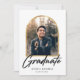 Golden Arch Foto Rahmen, Abschluss Anzeigenkarte. Modernes Pinselskript "Graduate" Overlay auf weißem Hintergrund mit marineblau hintergründiger Farbe.