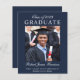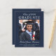Eine preisgünstige, einfache und elegante Ankündigung des dunkelblauen Abschlusses mit einem Foto des Absolventen, seinem Namen und Klassenjahr in einer weißen Schrift und seiner Schule, Hauptfach und Ehren in der modernen weißen Typografie.