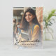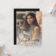 Moderne Abschluss-Ankündigung mit einem individuellen vertikalen Foto. Das Wort "Graduate" erscheint in schwarzer Schrift, mit dem Namen des Absolventen, Schule und Jahr des Abschlusses unten in Sans Serif Schriftart. Ersetzen Sie das Beispielbild einfach durch das Foto Ihres eigenen Absolventen. Ein Bildschirm mit weißem Farbverlauf trägt dazu bei, die Pop des Textes zu gewährleisten. Fügen Sie Details über die Leistungen Ihres Absolventen und zukünftige Pläne auf der Rückseite in goldfarbenem Text auf einem soliden schwarzen Hintergrund hinzu. Ideal für High School oder Uni-Abschluss.