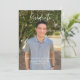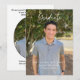 Eine moderne Script Graduate Foto Abschluss Announcement-Karte mit modernem Skript-Schriftart, volles Foto auf der Vorderseite mit Namen, Informationsklasse und Schuldetails. Die Rückseite hat ein zweites Foto mit weiteren Details.