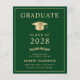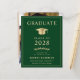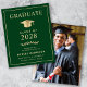 Elegante und preisgünstige Ankündigung eines grünen Abschlusses mit Goldgradmütze. Personalisieren Sie den Namen des Absolventen, Klassenjahr, Schule, Uni oder Universität, Abschluss und Hauptfach oder Auszeichnung in der modernen Leichtgold Typografie. Das Foto des Absolventen füllt die Rückseite der Karte aus.