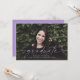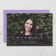 Diese vollständige Ankündigung von Foto Abschluss enthält das Wort "Absolvent" in lila Schrift auf der anderen Seite geschrieben. Es hat Platz für den Namen des Absolventen, das Klassenzjahr und die Schule. Die Rückseite der Karte kann für eine persönliche Nachricht oder für die Einladungsdetails der Graduiertenparty verwendet werden.