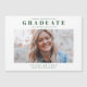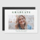 Eine einfache, saubere Foto-Abschluss-Ankündigung mit einem großen Absolventen-Typ und Studentenname über einem landschaftlichen Foto des Abschlusses.
