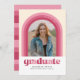 Diese lustige Abschluss-Ankündigung verfügt über einen Bogen mit verschiedenen Rosatönen um einen Single Foto. Die Rückseite der Karte hat ein koordinierendes Streifenmuster sowie Platz für eine persönliche Nachricht oder Einladungsdetails für eine Abschluss-Feier.