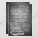 Ankündigung des Ruhestands mit alten abgenutzten und verwitterten Spitzen-Stiefeln im Chalkboard-Look. Geschlechterbezogene Texte, das Jahr, die Ehrentexte, das Datum, die Uhrzeit, der Ort der Feier und die UAWG können individuell angepasst werden.