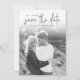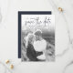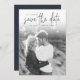 Ein modernes und stilvolles Save the Date Design mit einem reichhaltigen marineblau überlagerten Textteil und einem voll blutbedruckten senkrechten oder portraitorientierten Foto. "Save the Date" erscheint oben in der Hand gezeichnete Skripttypografie, mit Ihren Namen, Hochzeitstag und Standort in das Design stecken. Fügen Sie auf der Rückseite weitere Details hinzu, wie z.B. Ihre Hochzeitswebsite.