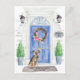 Mit unserer stilvollen Ankündigung kündigen Sie Ihre neue Adresse an: Border Terrier, blaue Haustür, Begrüßungsmatte, Schiefer-Schild, Topiaries und ein blumengeschmücktes Set auf grauem Backstein.