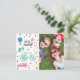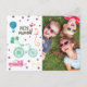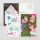 Adorable bewegliche Ansage Postkarten mit familiärem Foto auf der Vorderseite mit einer niedlichen regenbogenfarbenen Abbildung eines Fahrrads, Autos, Schlüssels, Luftballons und "Wir sind umgezogen!" Text. Auf der Rückseite der Postkarte befindet sich ein lustiges kleines Haus mit den neuen Adressdetails und dem handgeschriebenen "New Zuhause Sweet Zuhause" oben.