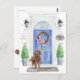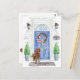 Mit unserer stilvollen Ankündigung kündigen Sie Ihre neue Adresse an: Labradoodle, blaue Haustür, Begrüßungstafel, Schiefer-Schild, Topiaries und ein blumengeschmücktes Set auf grauem Backstein.