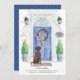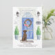 Mit unserer stilvollen Ankündigung kündigen Sie Ihre neue Adresse an: Braun Labrador Retriever, blaue Eingangstür, Begrüßungstafel, Schiefer-Schild, Topiaries und ein blumengeschmücktes Set auf grauem Backstein.