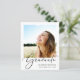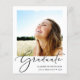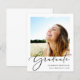Moderne preisfreundliche Abschluss-Ankündigung mit "Graduate" in einer eleganten Schrift und ihrem Foto, ihrem Namen, ihrer Schule und ihrem Klassenjahr in schlichter moderner Typografie.