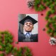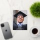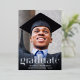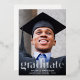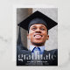 Eine elegante und stilvolle Abschluss-Ankündigung, die das Foto Ihres Absolventen mit "Graduate" in einem trendigen großen Typ in echter Silberfolie und seinem Namen, Schule und Klassenjahr überlagert.